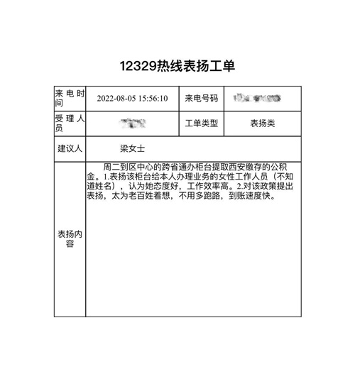 “感谢宁夏回族自治区住房资金管理中心跨省通办窗口工作人员热情周到的服务,让我不用专程跑到西安住房公积金中心办理业务,节省了我往返的时间和费用,这项业务真是为老百姓着想,实在太感激了。”“您好,我想要表扬一下宁夏回族自治区住房资金管理中心工作人员,她办理业务特别细心,甚至牺牲了午休时间为我们办理,特别感谢她,想对她提出表扬。”2022年,许多缴存职工通过拨打“宁夏12345政务服务热线”或“12329公积金服务热线”等方式对宁夏回族自治区住房资金管理中心工作人员提出表扬,成为宁夏回族自治区住房资金管理中心2022年度服务工作中的一道靓丽的风景线。
